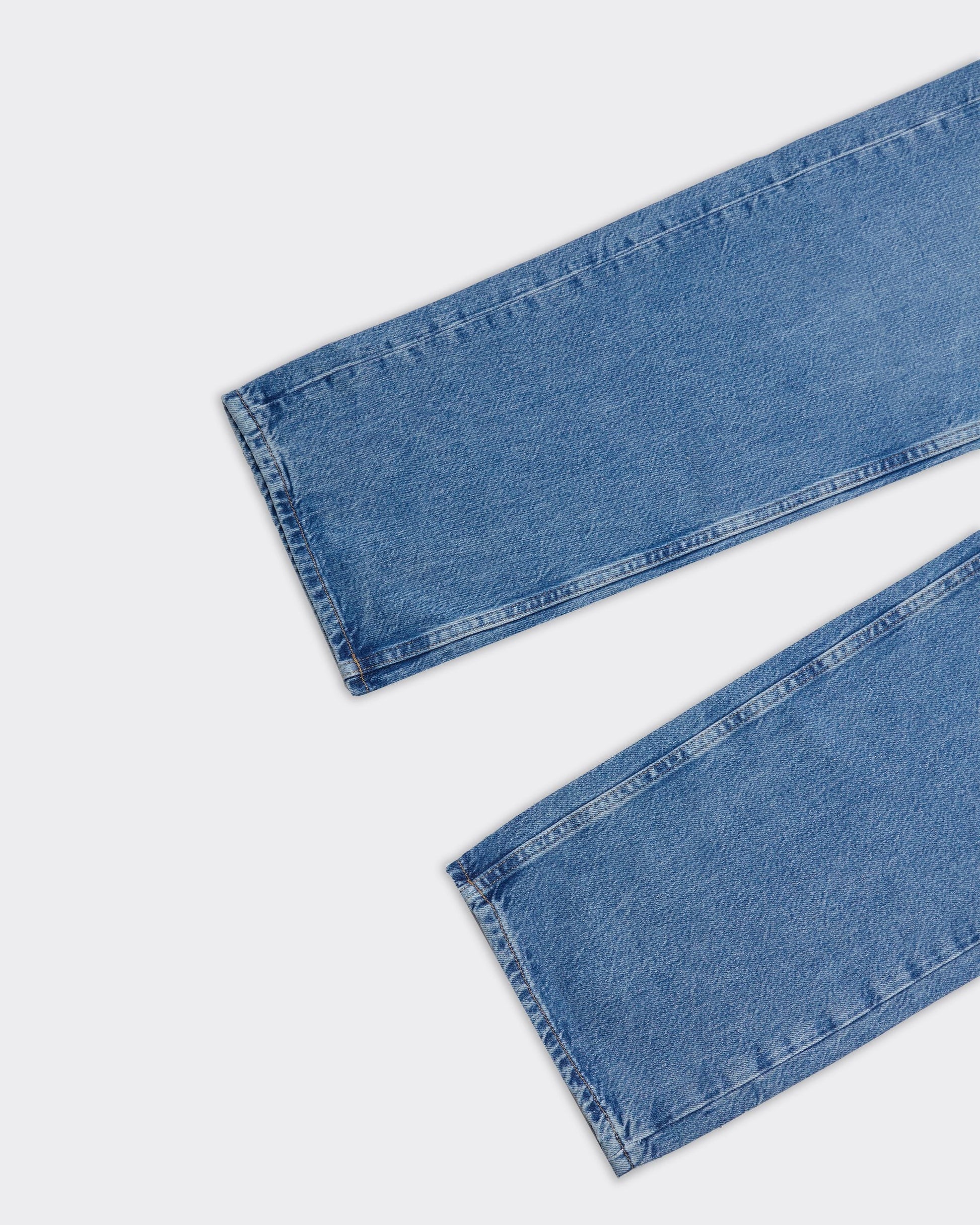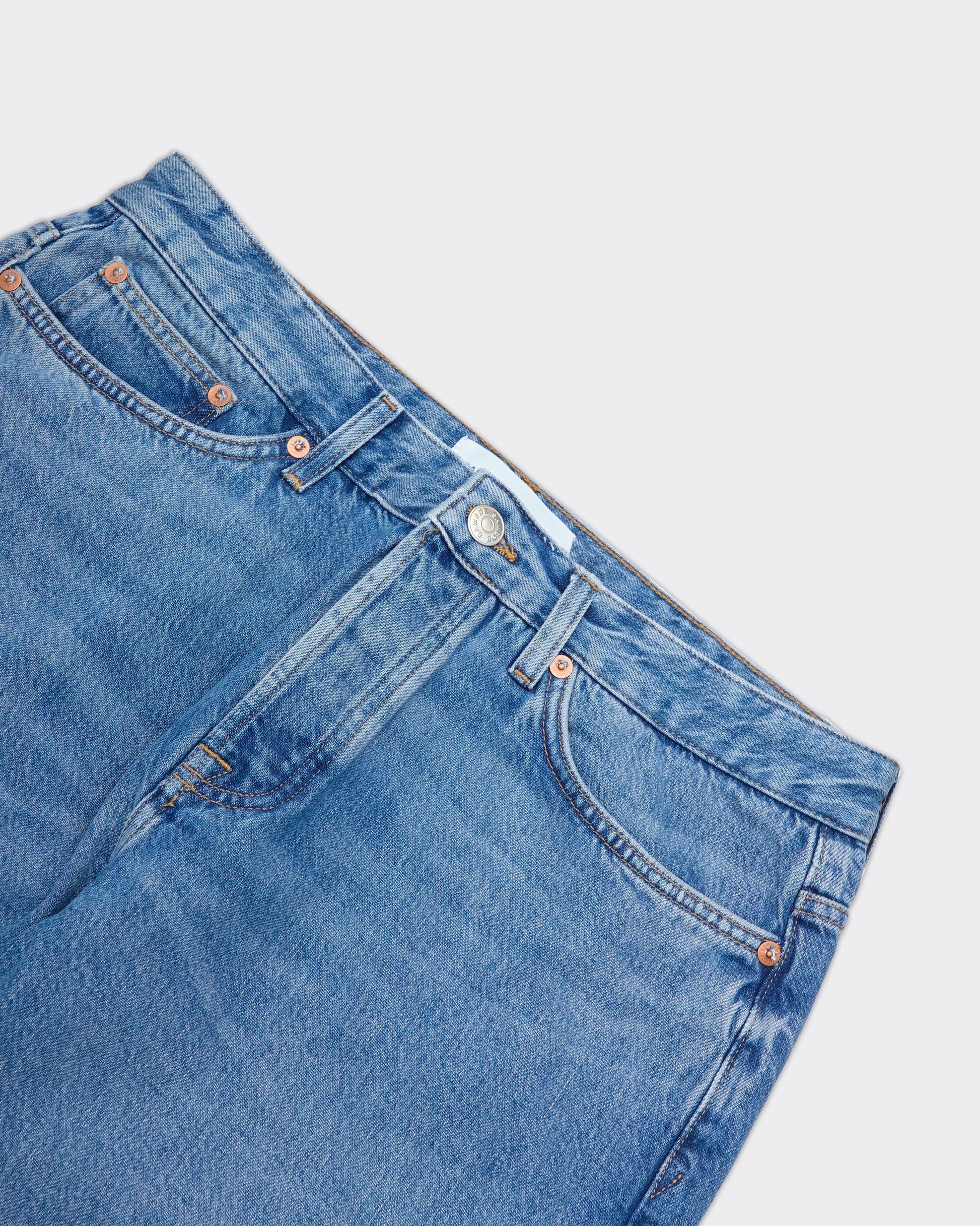 Jeans di colore blu chiaro con cuciture a contrasto visibili. Presentano cinque tasche e una targhetta in pelle sul retro della vita.