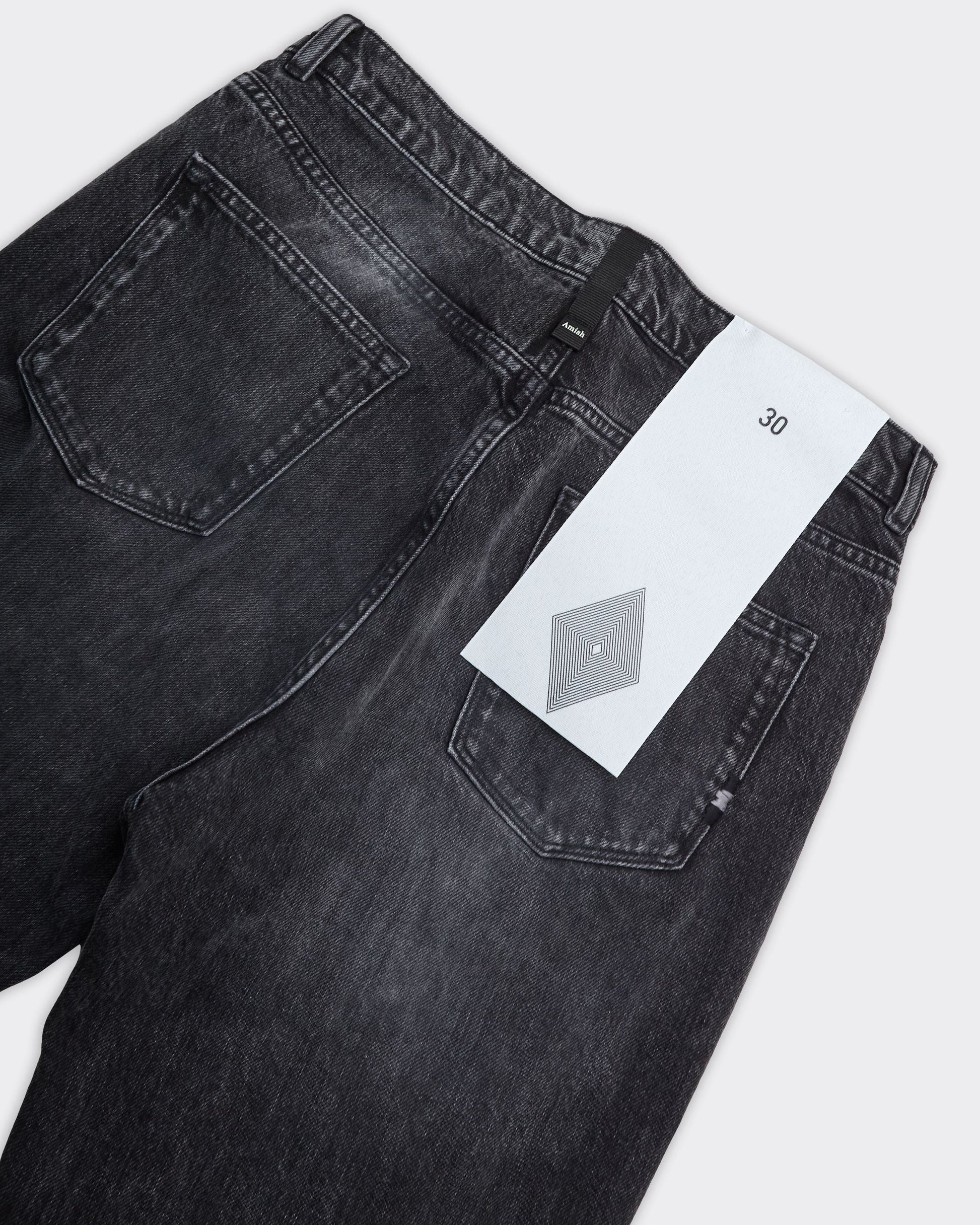 Jeans in denim nero con effetto sbiadito. Cinque tasche visibili: due sul retro, due laterali, uno piccolo sul davanti. Nessun logo, ricamo o stampa visibile.