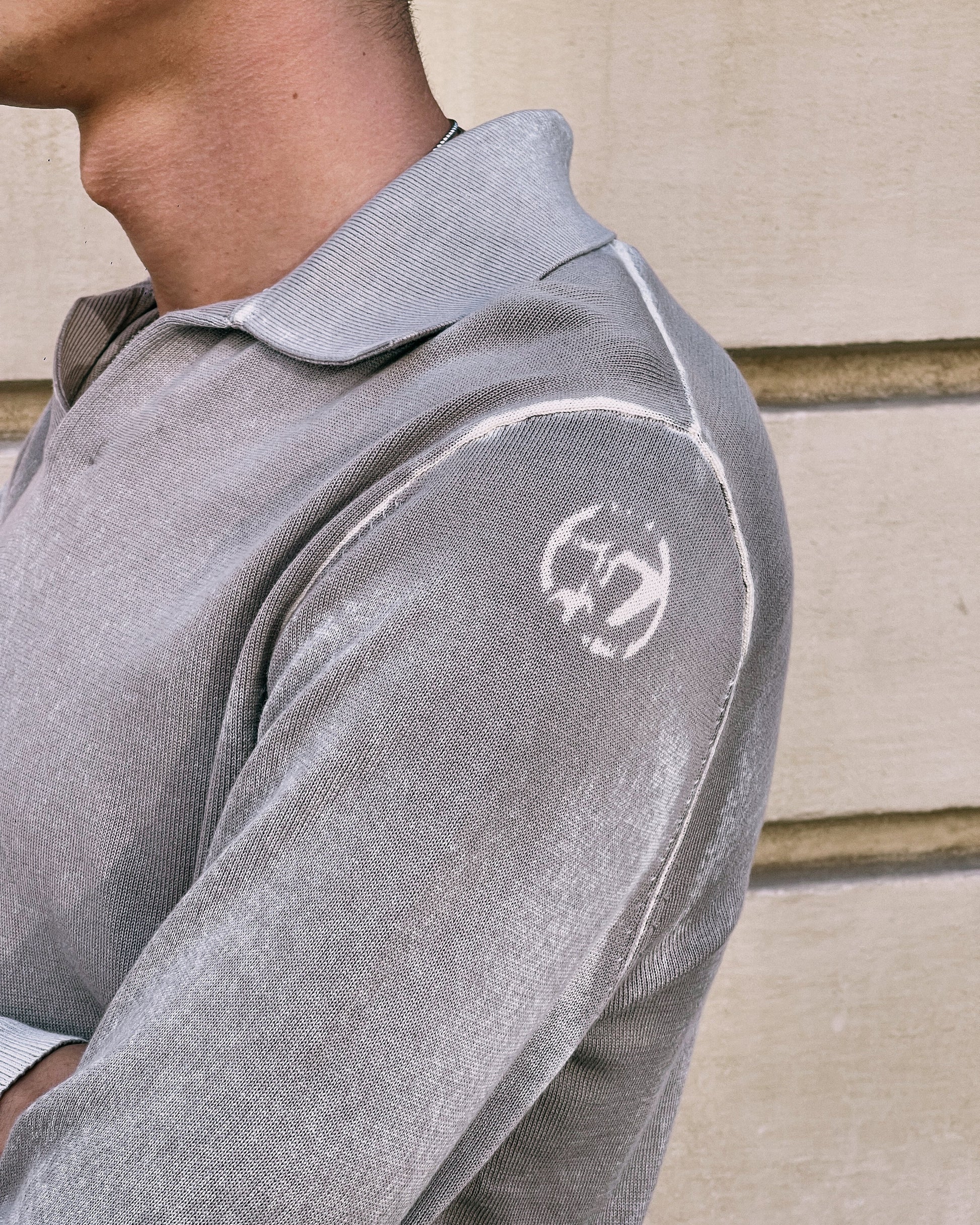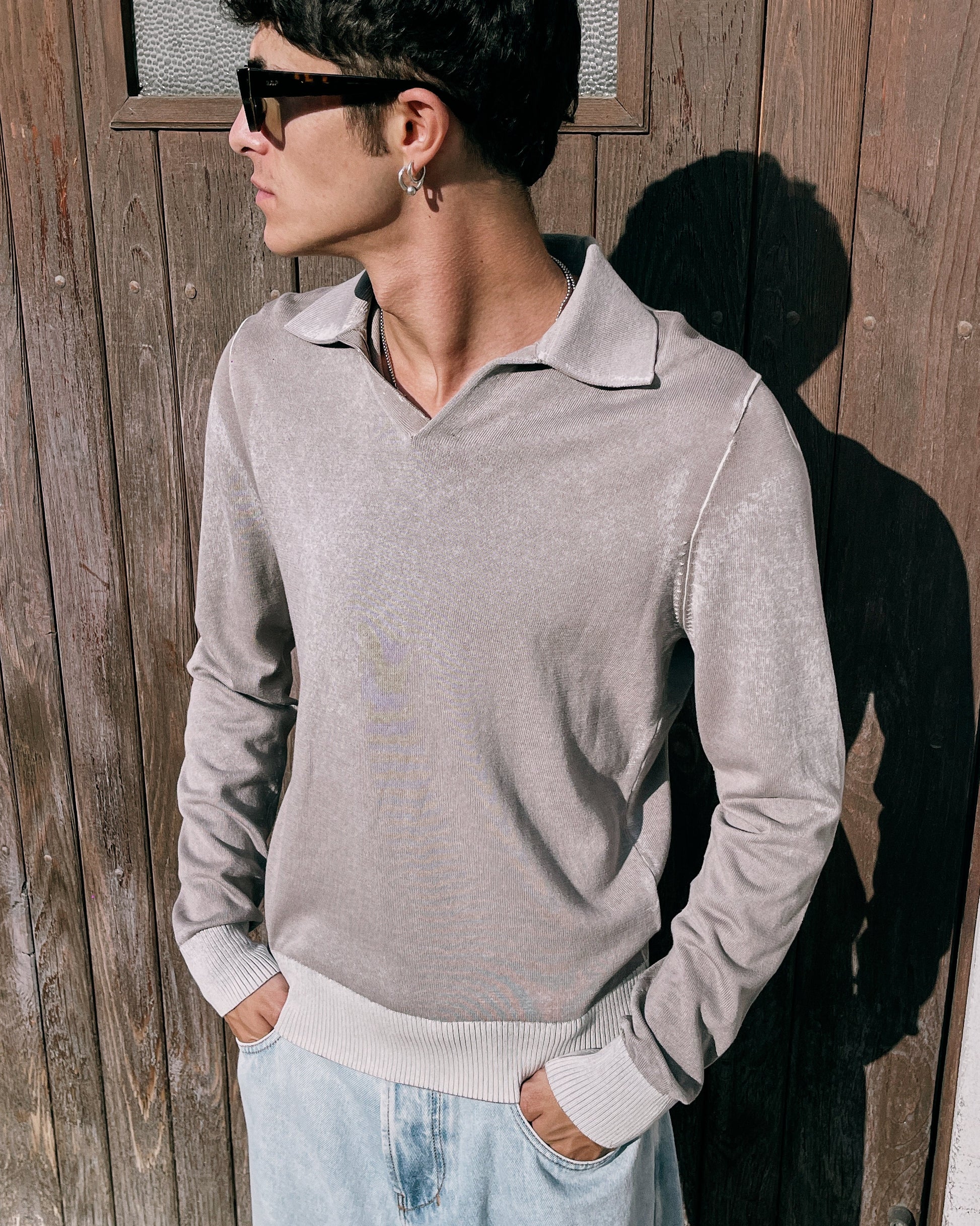 Maglione polo da uomo con vestibilità regular e colletto aperto che dona al capo un aspetto rilassato. Realizzato in cotone biologico, è stato stampato dall'interno, creando una colorazione sfumata e non uniforme. L'effetto di questa tecnica è particolarmente visibile sui bordi a coste, dove la tonalità è decisamente più chiara. Completato con un logo Oval D sulla manica.